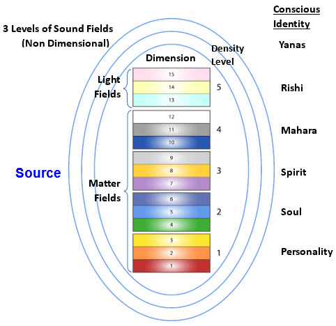 Creation emerges as a point of focus in Source. This begins to elaborate structure around a particular theme. This initially creates very fine fields of structure known as the Primal Sound fields. These fields are still highly conscious and integrated. Consciousness hasn’t yet separated out into individual units we would recognise as specific ‘beings’ or personages. There are large collectives of consciousness here referred to as the Yanas. ‘They’ are so highly integrated that they don’t need names as external handles, but it’s useful for us to have a reference point for communication. Like Source they are not remote from us. This is where we came from, our family ‘up the line’. The Sound Fields transcend dimensionalisation and time and as such can be regarded as Eternal Life Fields.