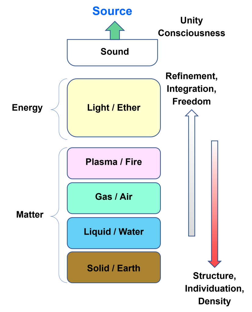 At the next level up matter is a bit freer, less dense and more fluid, resembling the liquid state (Density 2). Above this we have a greater level of freedom, resembling the gaseous phase (Density 3). The finest level of matter (Density 4), bridging between the Primal Light Fields and the other Matter Fields, corresponds to the plasma phase of matter. This is a state of highly energised and free matter or conversely condensed energy / light.