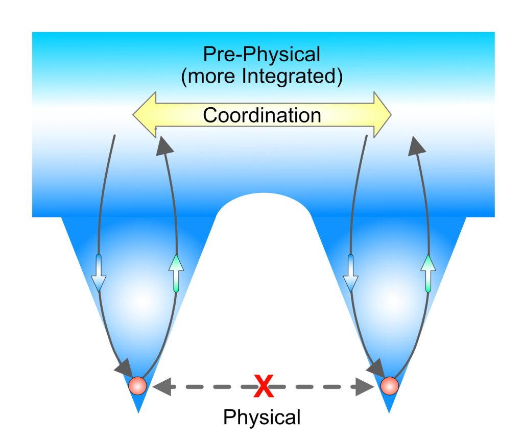 This is illustrated in the attached diagram. Two entangled particles are illustrated, with their arrowed creation cycles, in the triangular projections at the bottom of the diagram. These particles can be arbitrarily separated in physical reality, to the extent that physical communication isn’t possible. Their creation cycles are projecting from deeper, more subtle levels in creation, where there is much less separation. So, it is possible that coordination, illustrated by the yellow arrow near the top, occurs at this level and is being projected to the physical particles.