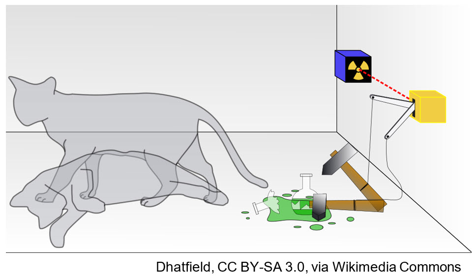 An observer outside the box is trying to assess the condition of the cat. Quantum reality only tells the observer that both states coexist in superposition. Yet when the observer opens the box, he / she will only find one of the states. The cat is either alive or dead. This raises the question. How did the superposition resolve into one specific state? How does the wave function that describes the coherence of superposition ‘collapse’, into the physical reality we actually perceive?