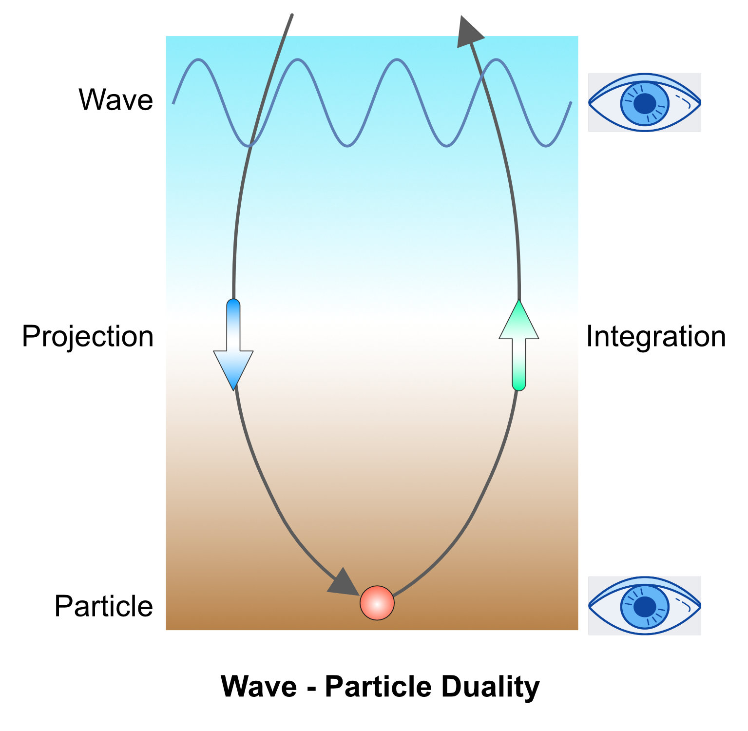 Consciousness is continuously projecting into and integrating out of creation in nested cycles of varying time duration. These vary from great cosmic events down to microscopic particles. So, particles will traverse the full range of levels in creation, from pure consciousness, through more refined integrated states, to the intense separation, localisation, density and mass of physical matter. This cycle is illustrated approximately by the arrows in the diagram. The behaviour we ‘see’ depends on which phase of the cycle we examine, wave or particle.